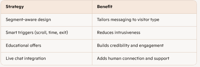 - Lead Generation: Pop-ups are excellent for collecting business emails, scheduling demos, or offering gated content like whitepapers and case studies.
